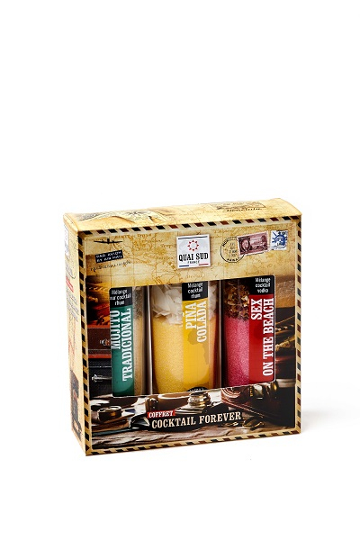 | Ingrédients : | Mélange pour cocktail Pina Colada : sucre de canne, morceaux d’ananas 12,7 % (ananas, sucre, acide citrique), rubans de noix de coco 12,7 %, tranches de bananes (banane, huile de coco, sucre, arôme), colorant: E102, arôme naturel goût ananas, arôme naturel goût noix de coco. Peut avoir un effet nuisible sur l’activité et l’attention des enfants. Mélange pour Mojito Tradicional : sucre de canne, écorces de citron, feuilles de menthe, arôme naturel goût citron vert, arôme naturel menthe. Mélange pour cocktail Sex on the Beach : sucre de canne, morceaux d’ananas (ananas, sucre, acide citrique), morceaux de cranberry (cranberry, sucre, huile de tournesol), écorces d’orange, pétales de rose, colorant naturel carmin, arôme (pêche de vigne), arôme naturel goût cranberry. |
